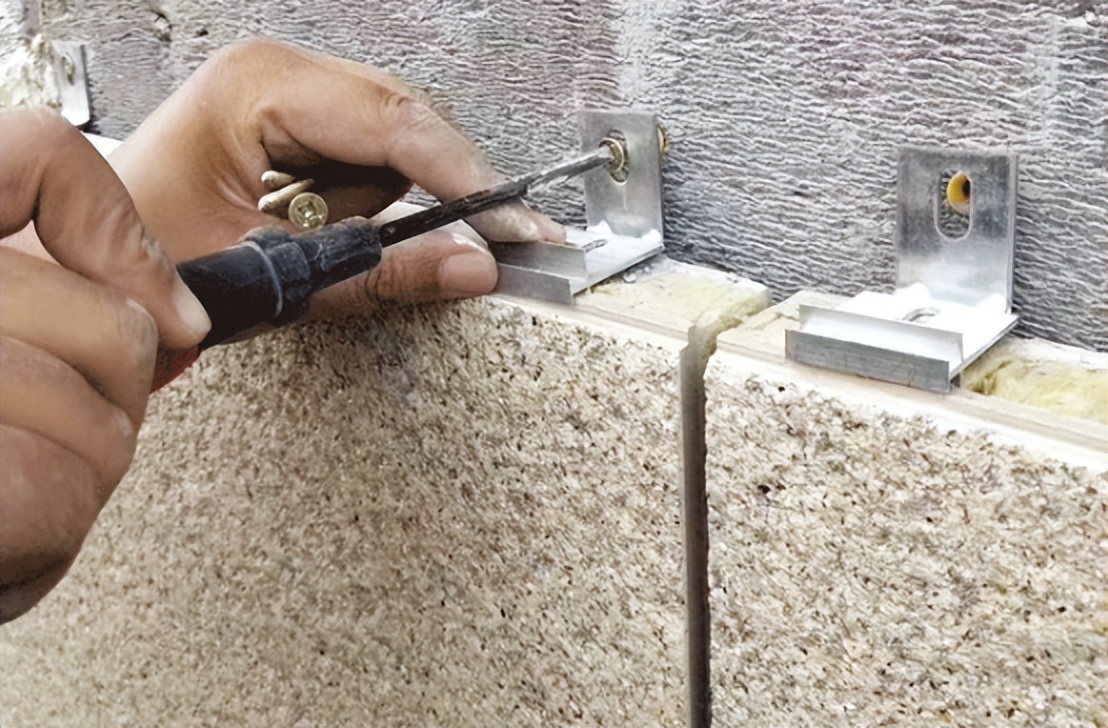 打孔埋置錨栓,固定錨固件。L型錨固件與H型掛件的連接件通過膨脹螺栓固定。