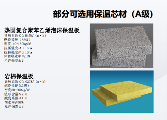 保溫芯材可選:熱固復(fù)合聚苯乙烯泡沫保溫板、巖棉保溫板、真金板、聚氨酯板等。