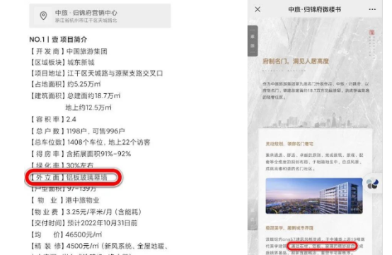 在此前該樓盤所有宣傳中,關(guān)于外飾面材質(zhì),對(duì)外口徑統(tǒng)一為鋁板+玻璃幕墻,從未出現(xiàn)涂料字眼。