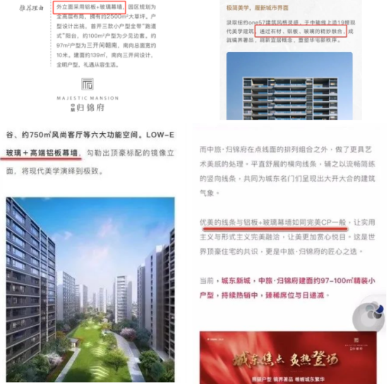 結(jié)合下面宣傳圖文,給購(gòu)房者的感受是,樓盤外飾面不論哪個(gè)部位所用的材料都是鋁板+玻璃幕墻的組合,位置包括但不限于窗框周圍、腰線、山墻等。