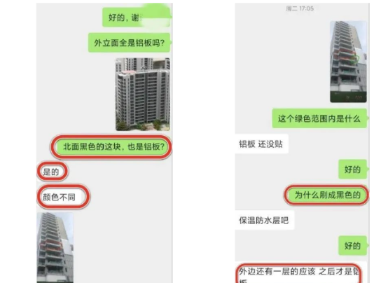 但是在建樓的過(guò)程中,似乎不太一樣了。有業(yè)主發(fā)現(xiàn)實(shí)際樓盤外飾面與宣傳的并不相符,業(yè)主們聯(lián)系銷售,針對(duì)業(yè)主指出問(wèn)題,銷售依舊說(shuō)外立面是鋁板+玻璃幕墻。