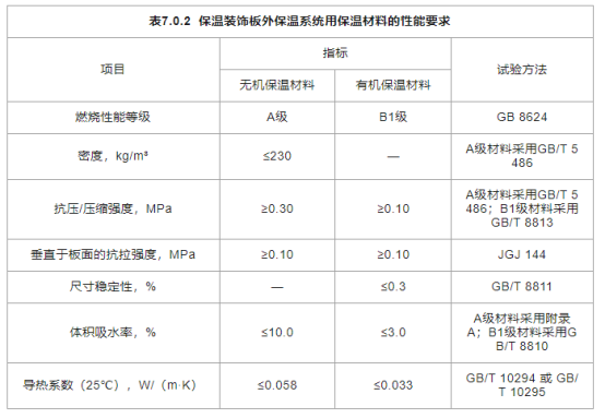 7.0.2 保溫裝飾板外保溫系統(tǒng)用保溫材料的性能應(yīng)符合表7.0.2的規(guī)定。