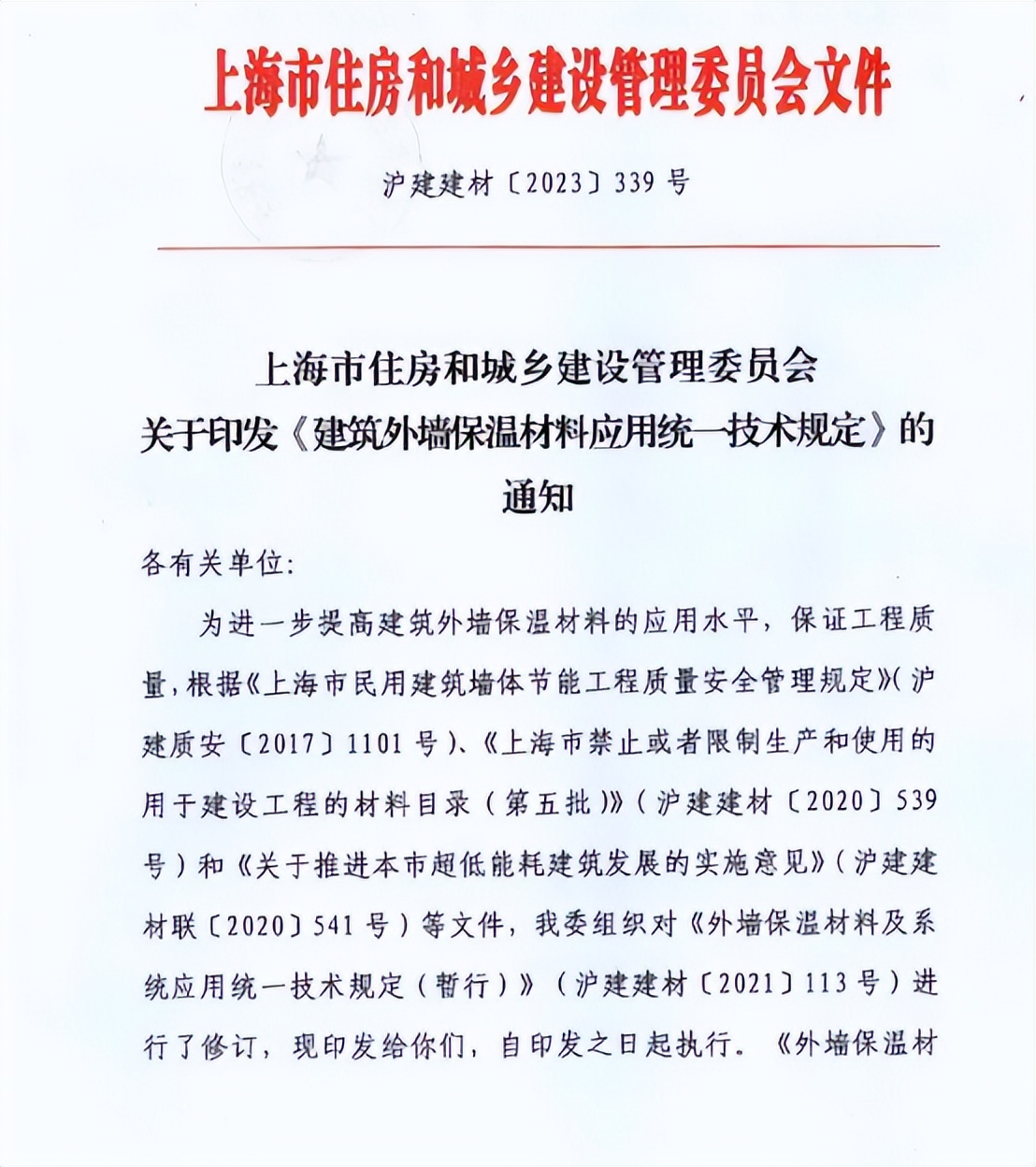 上海市發(fā)布《建筑外墻保溫材料應(yīng)用統(tǒng)一技術(shù)規(guī)定》,對保溫裝飾板外保溫系統(tǒng)用保溫材料的性能要求具體規(guī)范。