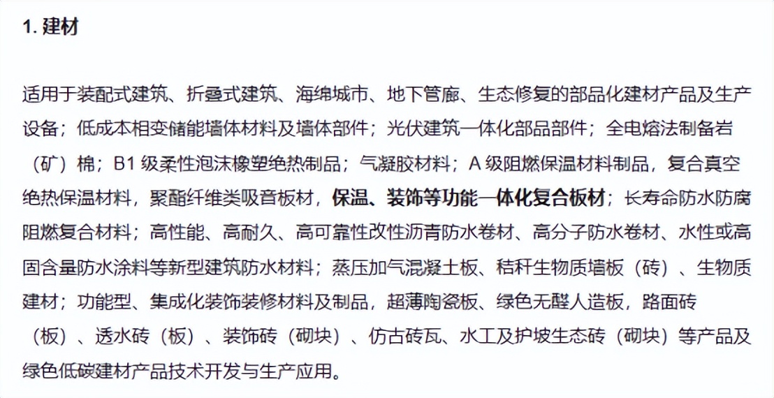 《產(chǎn)業(yè)結(jié)構(gòu)調(diào)整指導(dǎo)目錄(2023年本,征求意見(jiàn)稿)》中,保溫裝飾一體板被列入鼓勵(lì)類建材。