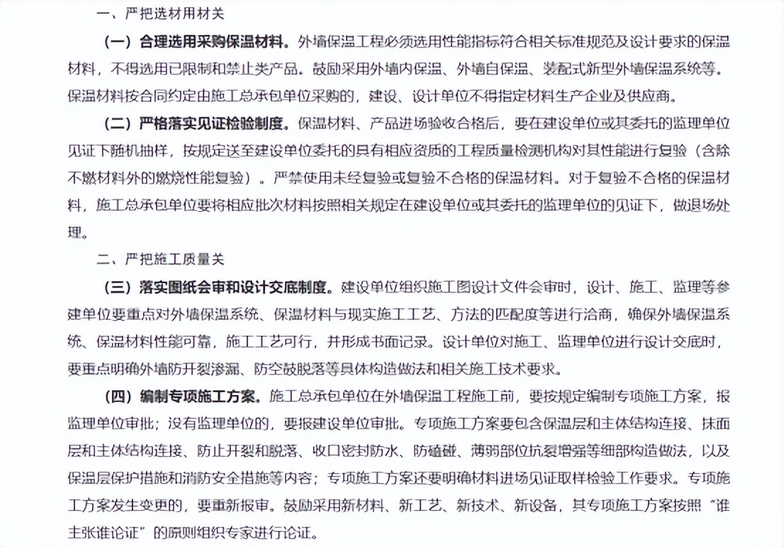 (四)編制專項施工方案。施工總承包單位在外墻保溫工程施工前,要按規(guī)定編制專項施工方案,報監(jiān)理單位審批;沒有監(jiān)理單位的,要報建設(shè)單位審批。專項施工方案要包含保溫層和主體結(jié)構(gòu)連接、抹面層和主體結(jié)構(gòu)連接、防止開裂和脫落、收口密封防水、防磕碰、薄弱部位抗裂增強(qiáng)等細(xì)部構(gòu)造做法,以及保溫層保護(hù)措施和消防安全措施等內(nèi)容;專項施工方案還要明確材料進(jìn)場見證取樣檢驗工作要求。專項施工方案發(fā)生變更的,要重新報審。鼓勵采用新材料、新工藝、新技術(shù)、新設(shè)備,其專項施工方案按照“誰主張誰論證”的原則組織專家進(jìn)行論證。