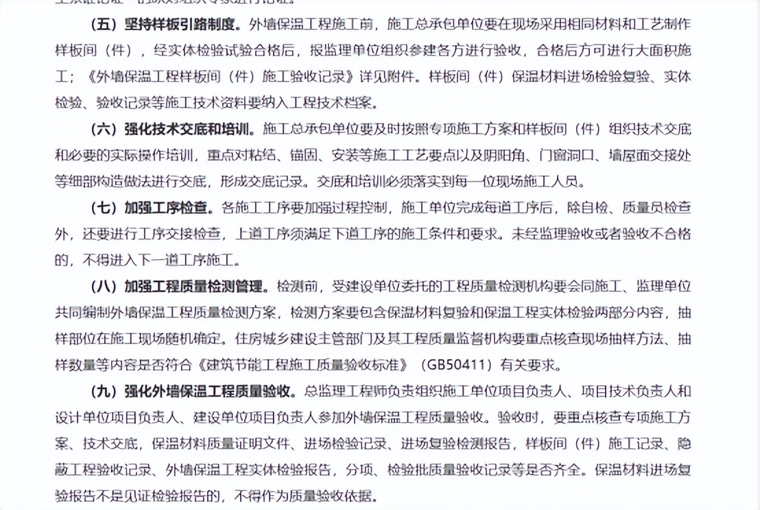 (八)加強(qiáng)工程質(zhì)量檢測管理。檢測前,受建設(shè)單位委托的工程質(zhì)量檢測機(jī)構(gòu)要會同施工、監(jiān)理單位共同編制外墻保溫工程質(zhì)量檢測方案,檢測方案要包含保溫材料復(fù)驗和保溫工程實體檢驗兩部分內(nèi)容,抽樣部位在施工現(xiàn)場隨機(jī)確定。住房城鄉(xiāng)建設(shè)主管部門及其工程質(zhì)量監(jiān)督機(jī)構(gòu)要重點核查現(xiàn)場抽樣方法、抽樣數(shù)量等內(nèi)容是否符合《建筑節(jié)能工程施工質(zhì)量驗收標(biāo)準(zhǔn)》(GB50411)有關(guān)要求。