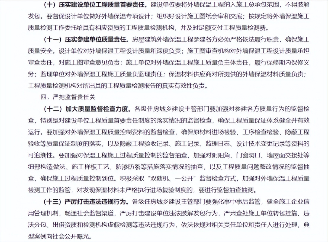 (十一)壓實參建單位質(zhì)量責(zé)任。房屋建筑外墻保溫工程參建各方必須嚴(yán)格依法履行職責(zé),確保施工質(zhì)量安全。設(shè)計單位對外墻保溫工程設(shè)計質(zhì)量和深度負(fù)責(zé);施工圖審查機(jī)構(gòu)對外墻保溫工程設(shè)計質(zhì)量承擔(dān)審查責(zé)任,對施工圖審查意見負(fù)責(zé);施工單位對外墻保溫工程施工質(zhì)量負(fù)主體責(zé)任,履行保修期內(nèi)保修義務(wù);監(jiān)理單位對外墻保溫工程施工質(zhì)量負(fù)監(jiān)理責(zé)任;保溫材料供應(yīng)商對所提供的外墻保溫材料質(zhì)量負(fù)責(zé);工程質(zhì)量檢測機(jī)構(gòu)對所出具的工程質(zhì)量檢測報告的真實有效性負(fù)責(zé)。