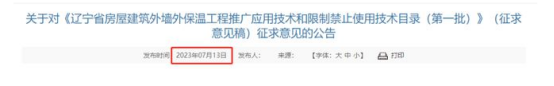 2023年07月13日,遼寧省住建廳發(fā)布關(guān)于對《遼寧省房屋建筑外墻外保溫工程推廣應(yīng)用技術(shù)和限制禁止使用技術(shù)目錄(第一批)》(征求意見稿)征求意見的公告。
