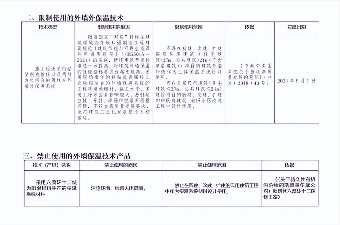2024年5月1日起,禁止在新建、改建、擴(kuò)建高層民用建筑(住宅建筑>27m;公共建筑>24m(不含單層建筑))項(xiàng)目中使用限制類外墻外保溫技術(shù)。嚴(yán)禁在外墻外保溫系統(tǒng)中使用禁止類技術(shù)產(chǎn)品。