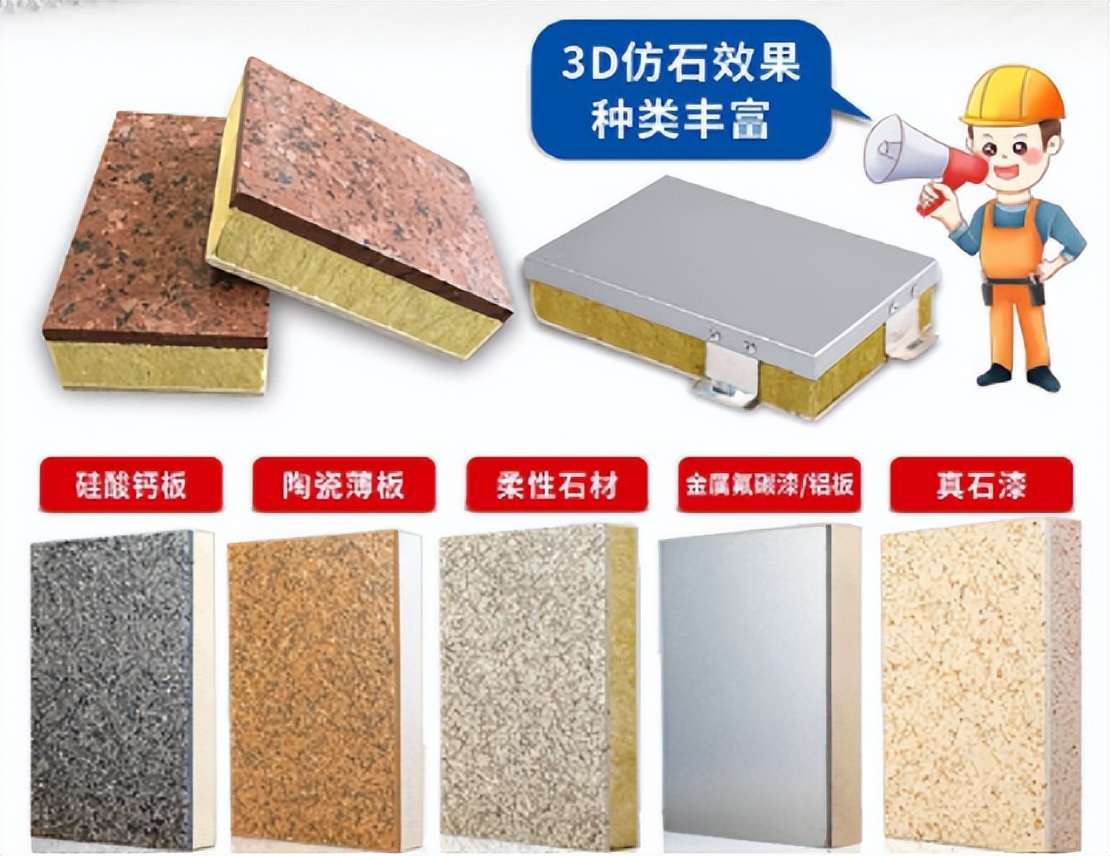 外墻保溫裝飾一體板由保溫材料、裝飾材料和增強(qiáng)材料組成。其中,保溫材料可以選擇聚苯乙烯板、石墨聚苯板、巖棉板等;裝飾材料可以選擇鋁板、瓷磚、天然石材等;增強(qiáng)材料可以選擇纖維增強(qiáng)硅酸鹽板、纖維增強(qiáng)水泥板等。在選擇材料時(shí),需要根據(jù)建筑的具體要求和使用環(huán)境來選擇合適的材料。